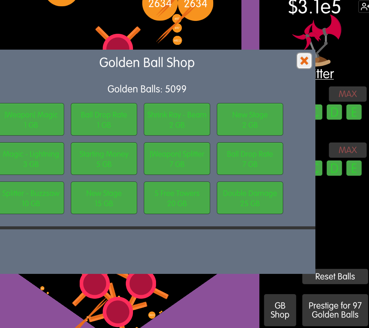 It was a really fun game, though one thing I would like if do decide to release a full version is that the game near the end just becomes a waiting game. I had like 5 towers remaining and had bought all gb upgrades and tower upgrades so there was nothing to do, so the only way to max it out was afk. I left my pc on before sleeping and had to upgrade in the morning. The golden balls after prestige were good though